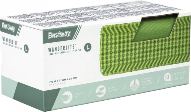 Mėgaukitės patogiu miegu per kiekvieną kelionę su pripučiamu kilimėliu BESTWAY WanderLite Large. Jo matmenys 198 × 71 × 6,5 cm, svoris tik 686 g ir kompaktiška pakuotė 10 × 10 × 23 cm. CrossWing konstrukcija su pakreiptomis oro kišenėmis užtikrina stabilumą ir komfortą, patvarios ToughLite ir 70D ripstop nailono medžiagos atlaiko intensyvų naudojimą, o žemo profilio vožtuvas leidžia greitai pripūsti, išleisti orą ir tiksliai sureguliuoti kietumą. R-vertė 1.3 idealiai tinka šiltoms dienoms ir vasaros naktims.