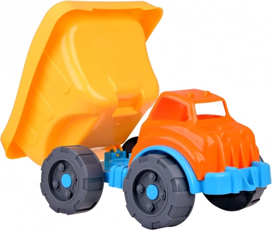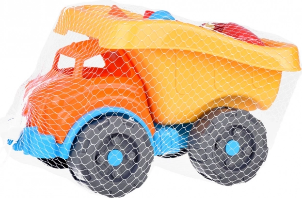 - Pilna komplektacija: sunkvežimis su kėbulu, kibiras, laistytuvas, semtuvėlis, grėbliukas ir 4 formelės (sraigtasparnis, automobilis, burinė valtis, garlaivis).