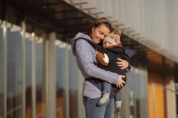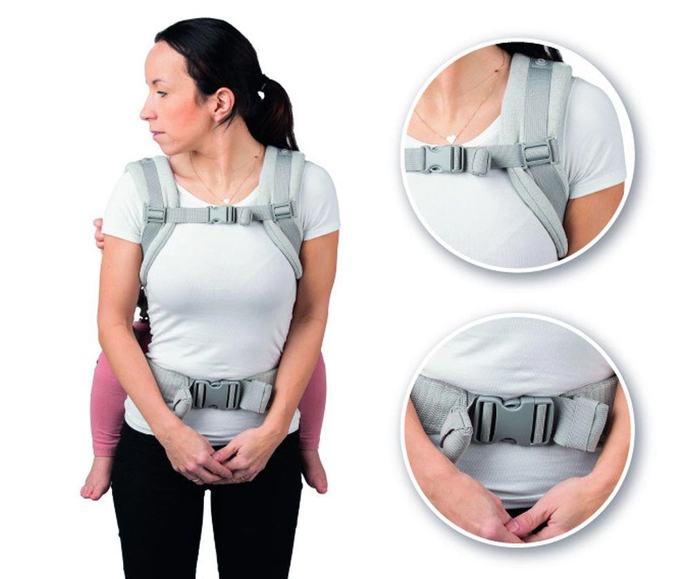Platus juosmens diržas, minkšti pečių dirželiai ir uždengtos sagtelės padeda tolygiai paskirstyti svorį ir didina komfortą net ilgesnio nešiojimo metu. Nuimamas gobtuvėlis saugo vaiko galvytę.
