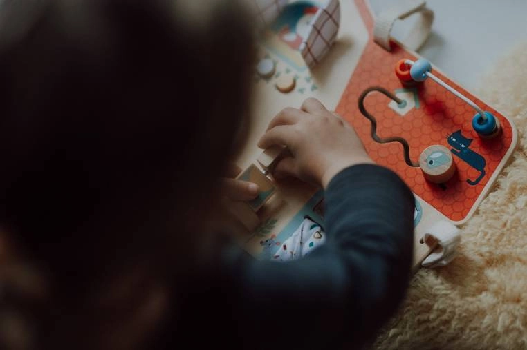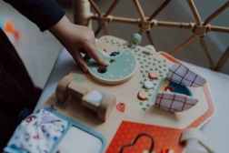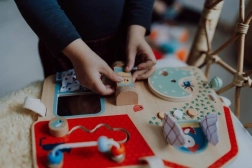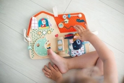 Lentelėje yra čežantis langelis, mygtukai, varpelis ir sukami elementai vaiko raidai skatinti.