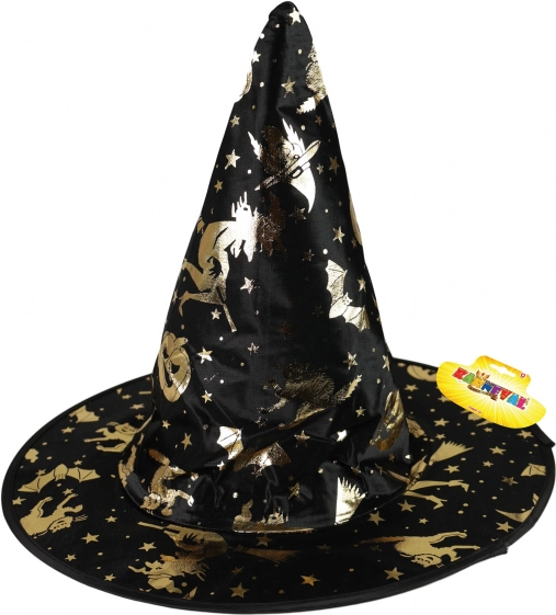 Suteikite vaiko kostiumui tikrą magišką akcentą. Lengva ir patogi juodos spalvos skrybėlė nusėta auksiniais papuošimais, kurie šviesoje įspūdingai žvilga. Puikiai priglunda ir lengvai derinama su apsiaustu bei kauke.