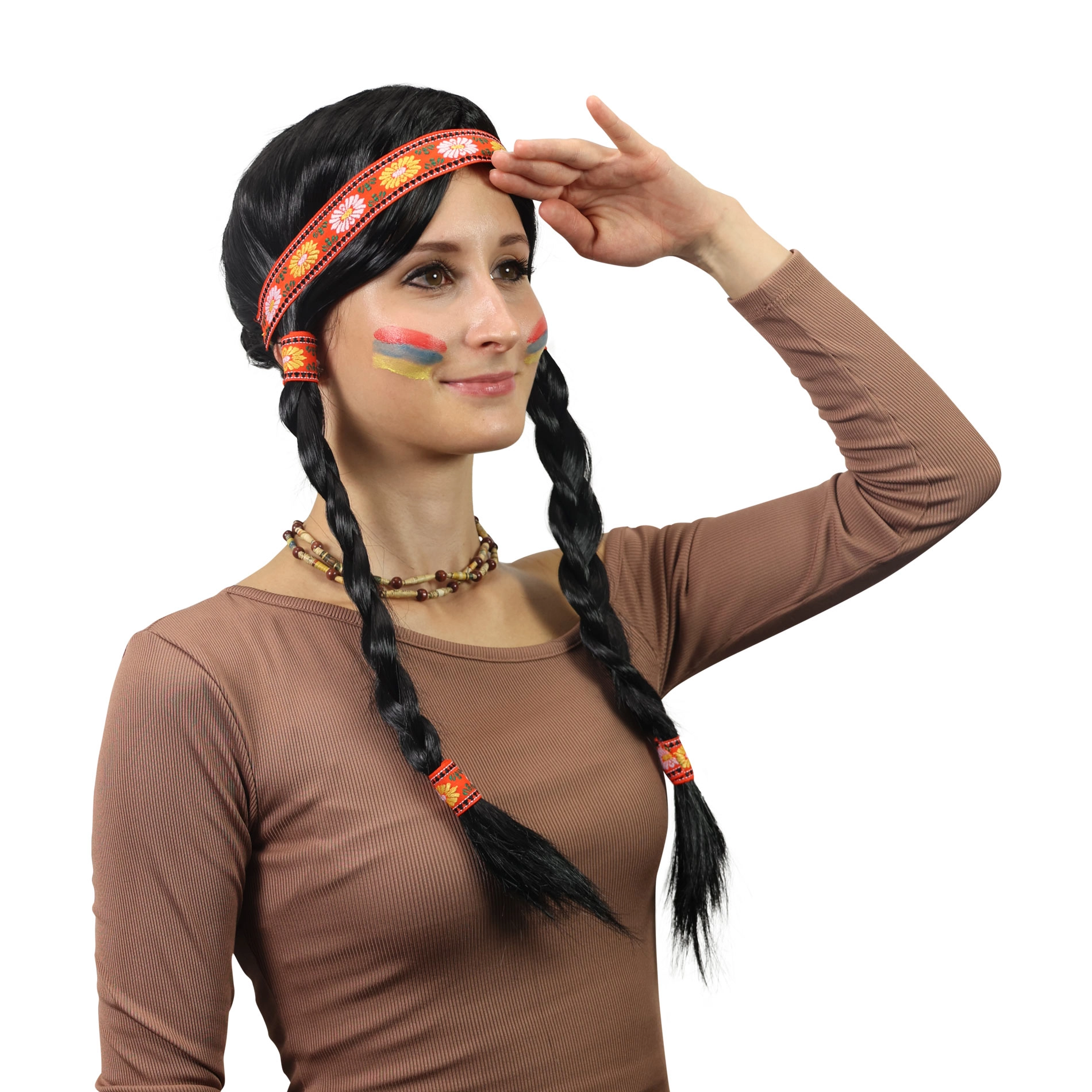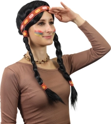 Perukas papildytas stilingu lankeliu ir raštuotomis juostelėmis ant kasų, kurios pabrėžia indėnišką išvaizdą ir suteikia kostiumui išskirtinį charakterį.