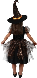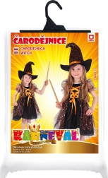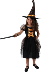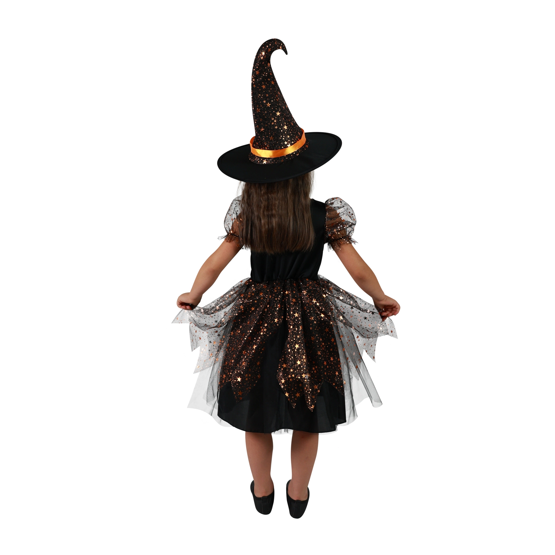 Suknelė gausiai dekoruota oranžiniais elementais ir metalizuotomis žvaigždutėmis, kurios patraukia dėmesį iš pirmo žvilgsnio. Kostiume taip pat yra raganos kepurė, kuri suteikia visam rinkiniui autentišką įvaizdį.