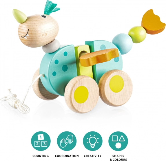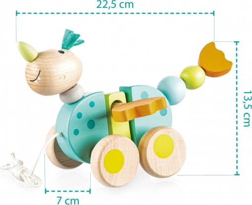 Mielas medinis drakonas su virvele skatina vaikus žengti pirmuosius žingsnius. Judėdamas plasnoja sparnais ir uodega, lavina motoriką, koordinaciją ir kūrybiškumą. Pagaminta iš buko medienos ir vandens pagrindo dažų, tinka vaikams nuo 16 mėnesių.