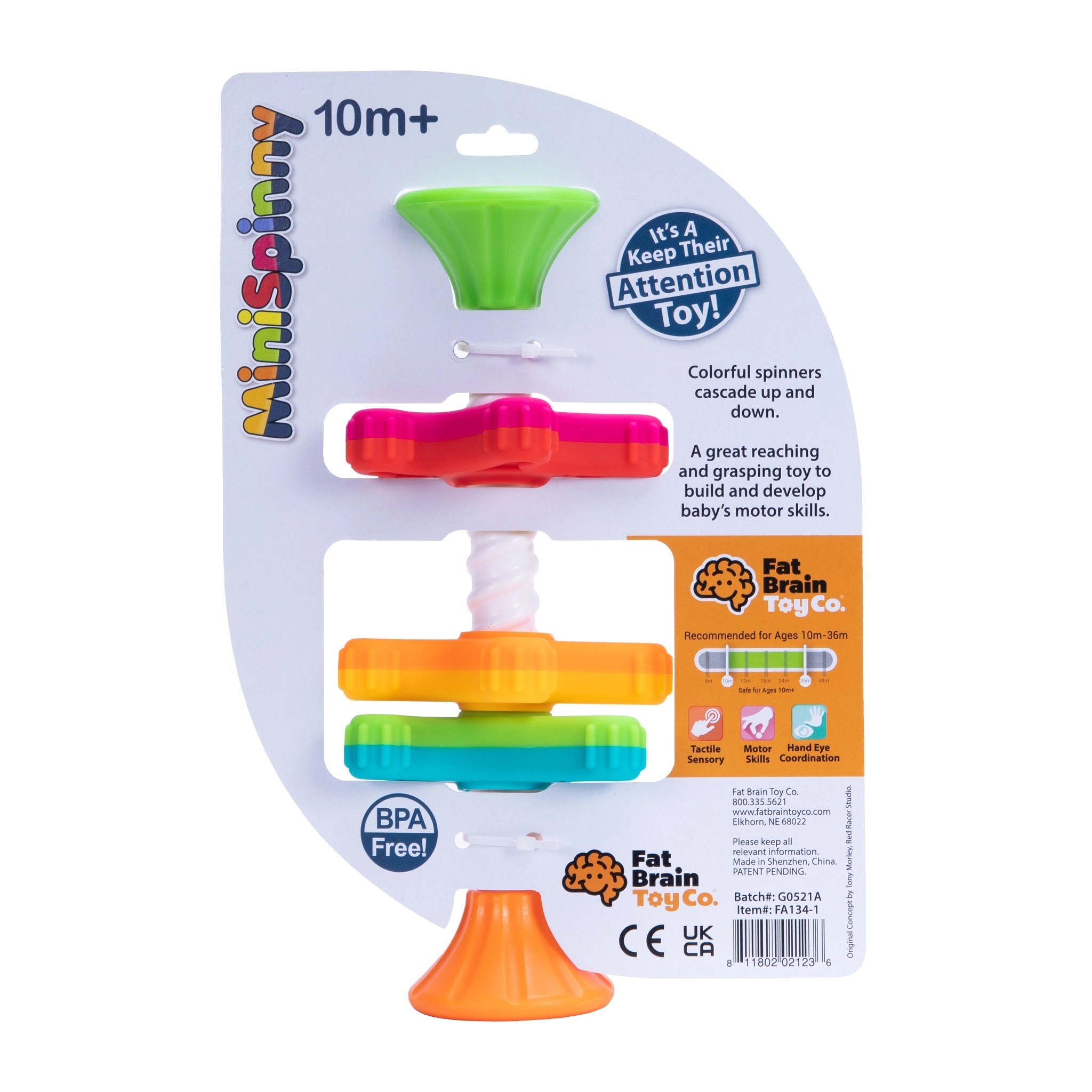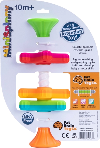 MiniSpinny – išmanus sensorinis žaislas, kuris sudomina vaikus judesiu, spalvomis ir lytėjimu. Trys diskeliai su skirtingu „kojelių“ skaičiumi sklandžiai leidžiasi spiraline lazdele ir kuria žavų vizualinį efektą. Tekstūruoti paviršiai skatina tyrinėti ir natūraliai lavina lytėjimą bei koordinaciją.