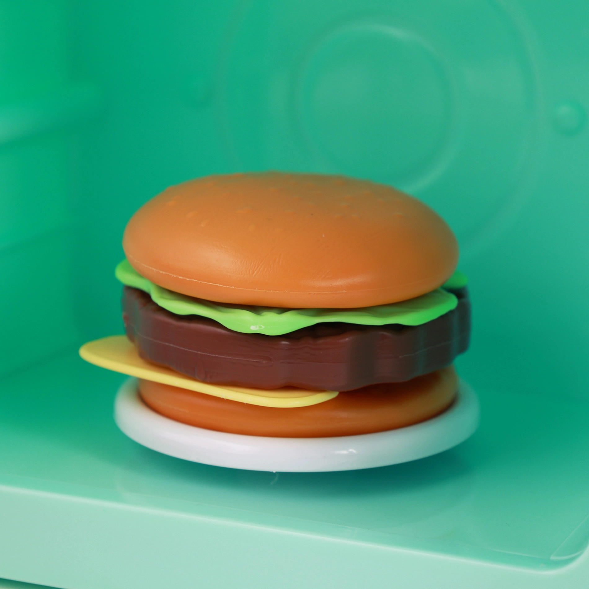 Žaislas pagamintas iš kokybiško PVC, o rinkinyje yra trys maisto priedai (mėsainis, viščiukas, pica), kurie padeda lavinti vaizduotę, smulkiąją motoriką ir vaidmenų žaidimus. Veikia su 3× AA baterijomis (neįeina). Kompaktiškas dydis – maždaug 26,5 × 17 × 17 cm – tinka bet kuriai vaikiškai virtuvei.