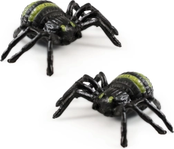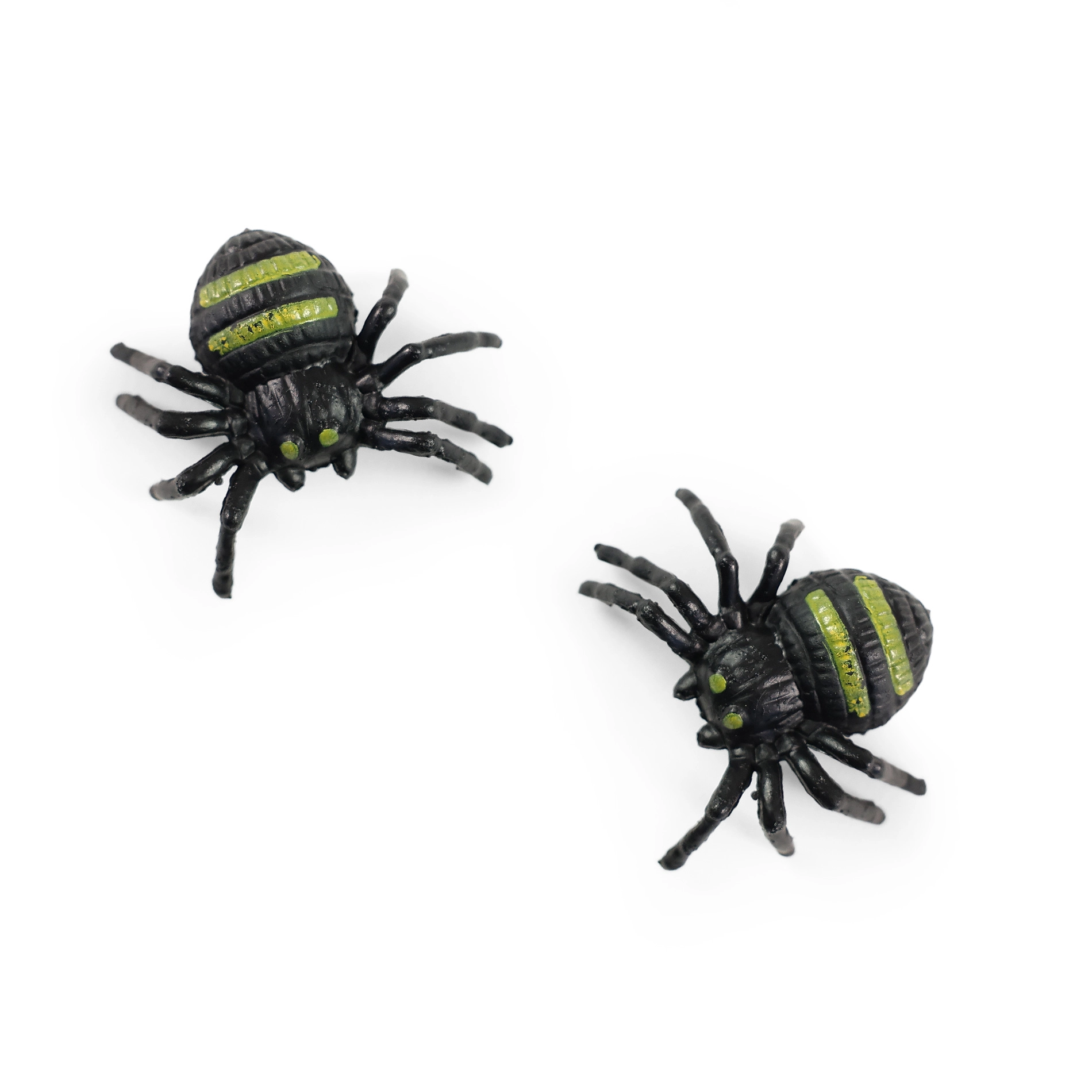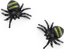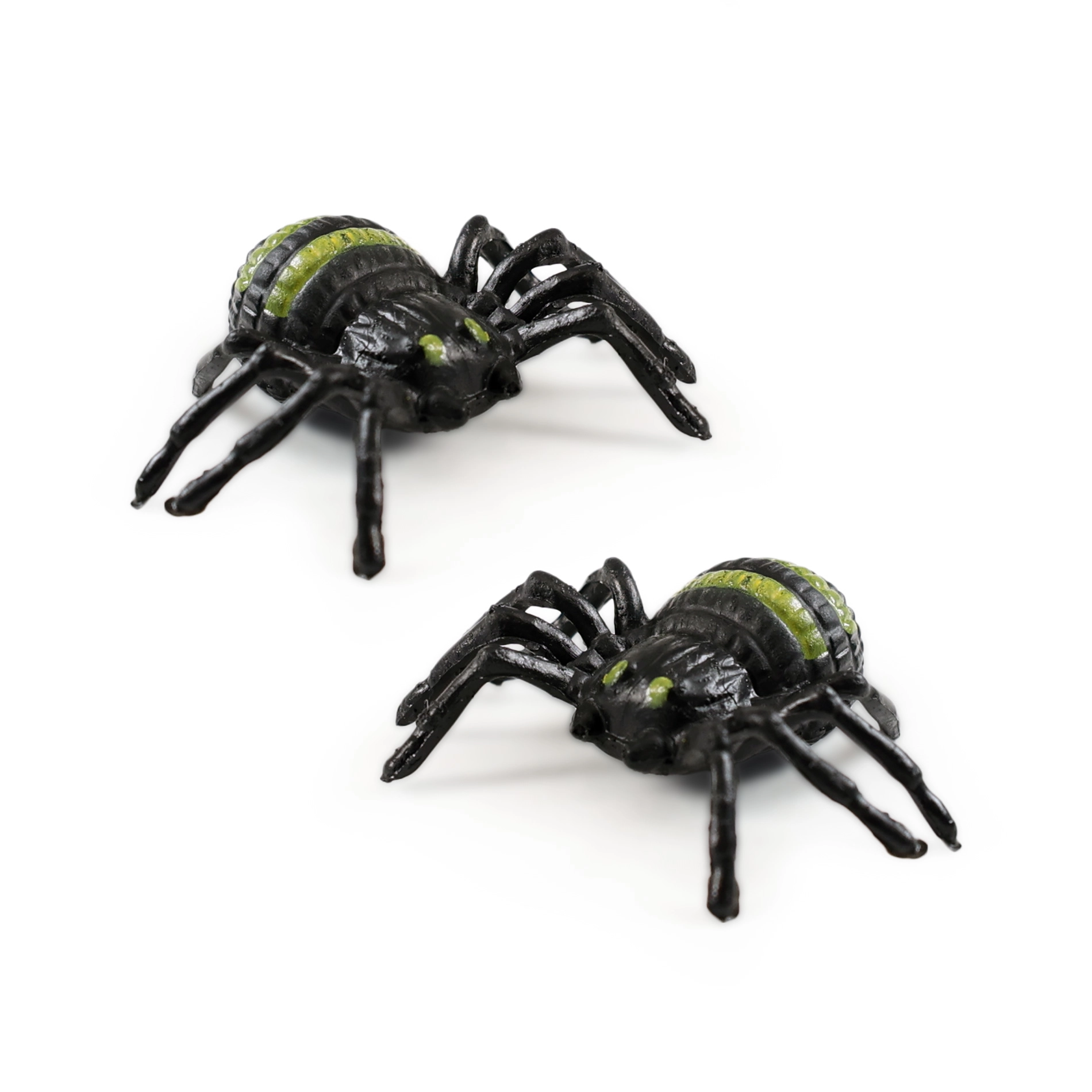Du plastikiniai vorai su juodais kūnais ir žaliomis juostomis ant nugaros – puikiai tinka dekoracijoms ar Helovino aksesuarams.