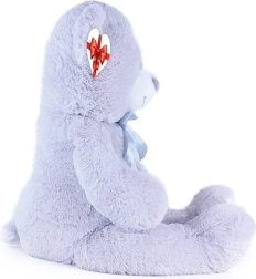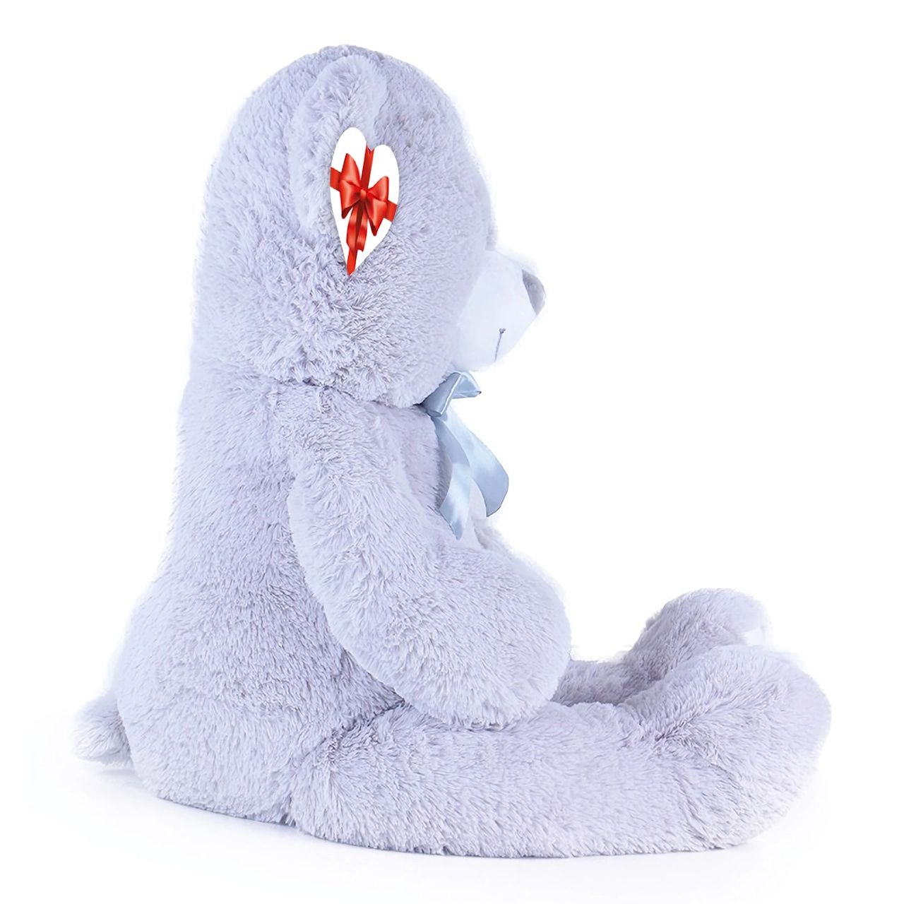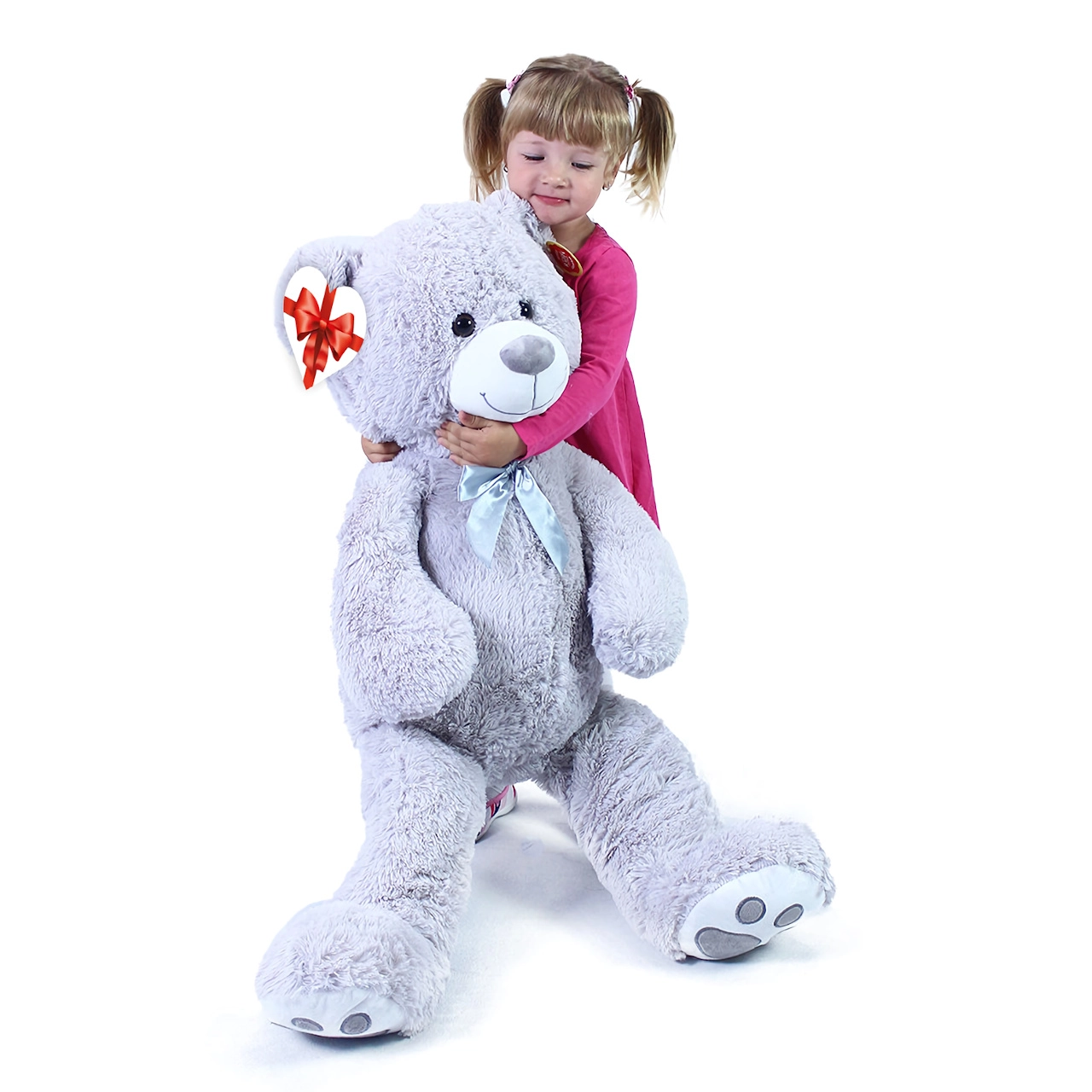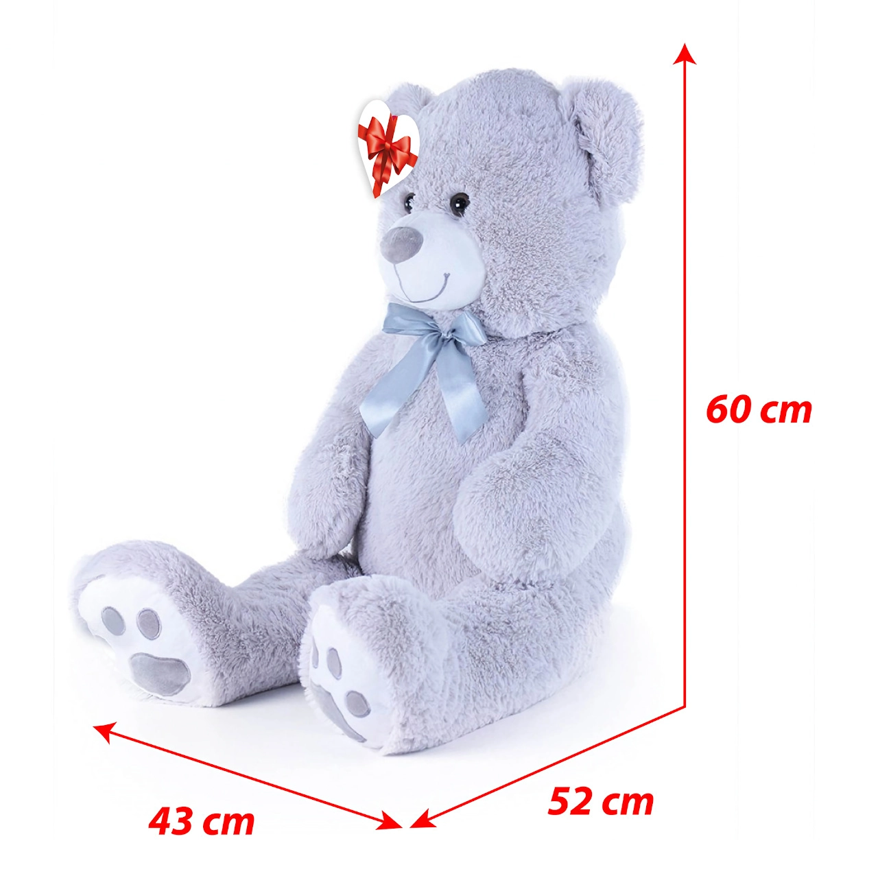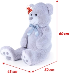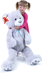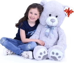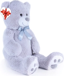 Didelis pilkas pliušinis meškinas, apie 100 cm ilgio, džiugina savo minkštumu, jaukumu ir kokybišku atlikimu. Švelnus paviršius vilioja prisiglausti, satino kaspinas suteikia elegancijos, o širdelės formos etiketė leidžia pridėti asmeninę žinutę – idealu gimtadieniams, šventėms ar kaip vaikų kambario dekoracija.
