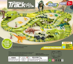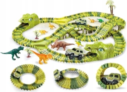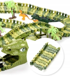 Sukurkite vaikams priešistorinių nuotykių pasaulį. Rinkinyje yra viskas ilgam ir kūrybiškam žaidimui: modulinė žalia trasa, 8 dinozaurai (įskaitant 2 didelius), 2 tuneliai dinozauro galvos formos, tiltai, medeliai ir elektrinis automobiliukas su AA baterija. Dalys paprastai susijungia, o automobiliukas trasa važiuoja pats.