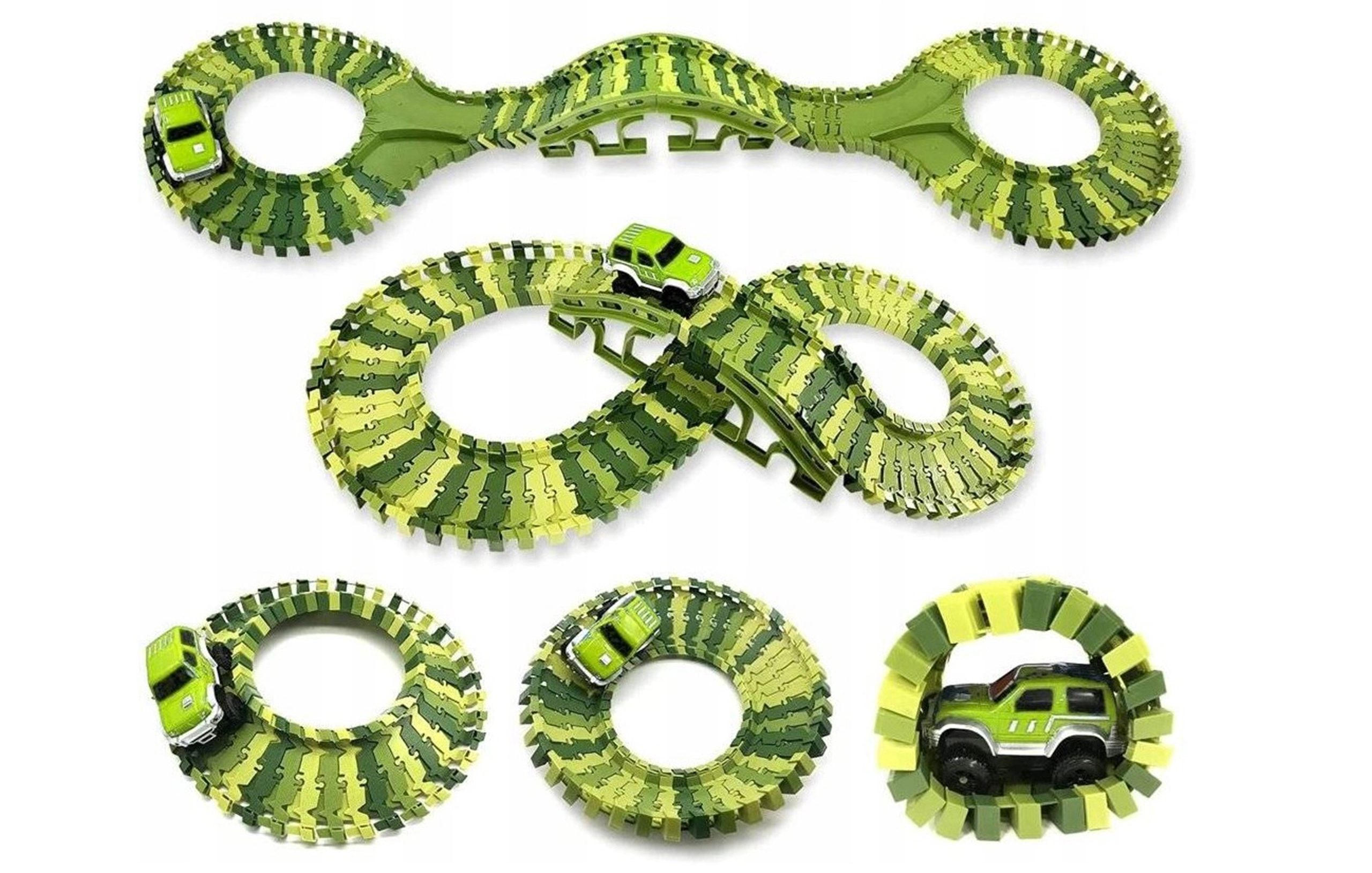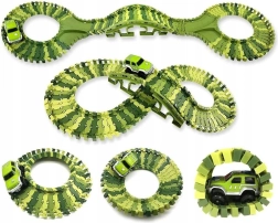 Maksimalūs surinktos trasos matmenys apie 80 × 85 × 8 cm, tad ji lengvai tilps vaikų kambaryje. Rinkinys lavina kūrybiškumą, erdvinį mąstymą ir rankų įgūdžius, o kartu suteikia dinamišką važiavimą dėl elastingo trasos paviršiaus su geru automobiliuko sukibimu.