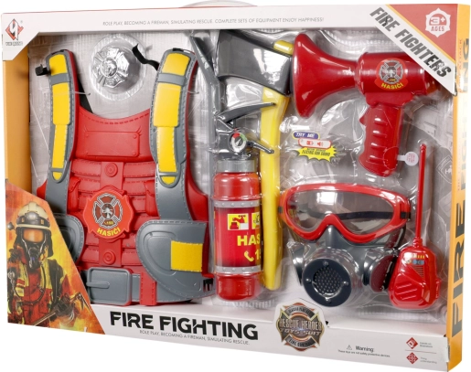 - Gesintuvas (pildomas vandeniu), liemenė, gaisrininko ženklelis, racija (imitacija), kirvis (žaislinis), laužtuvas (žaislinis), apsauginė veido kaukė (žaislinė), megafonas