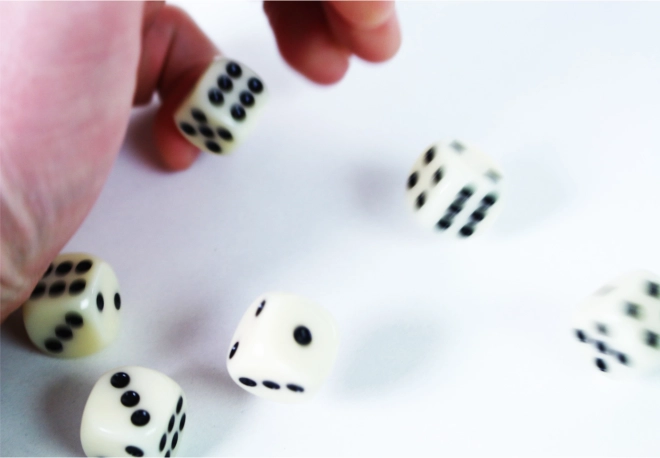 - Kiekvienas kauliukas yra standartinio dydžio ir turi aiškiai įskaitomus juodus taškus.