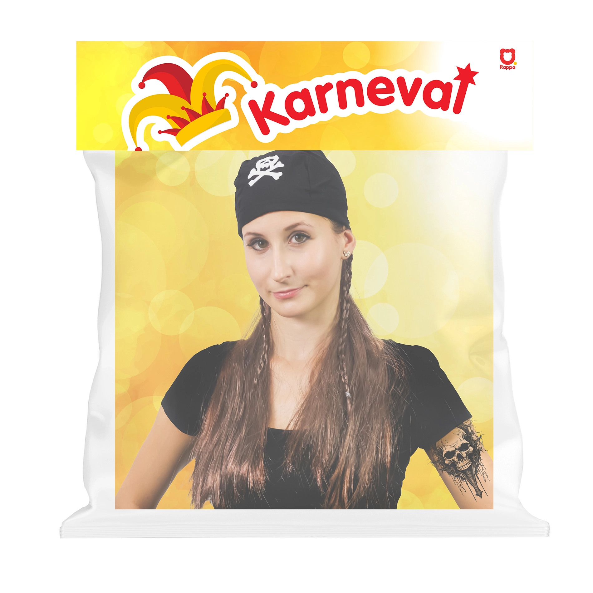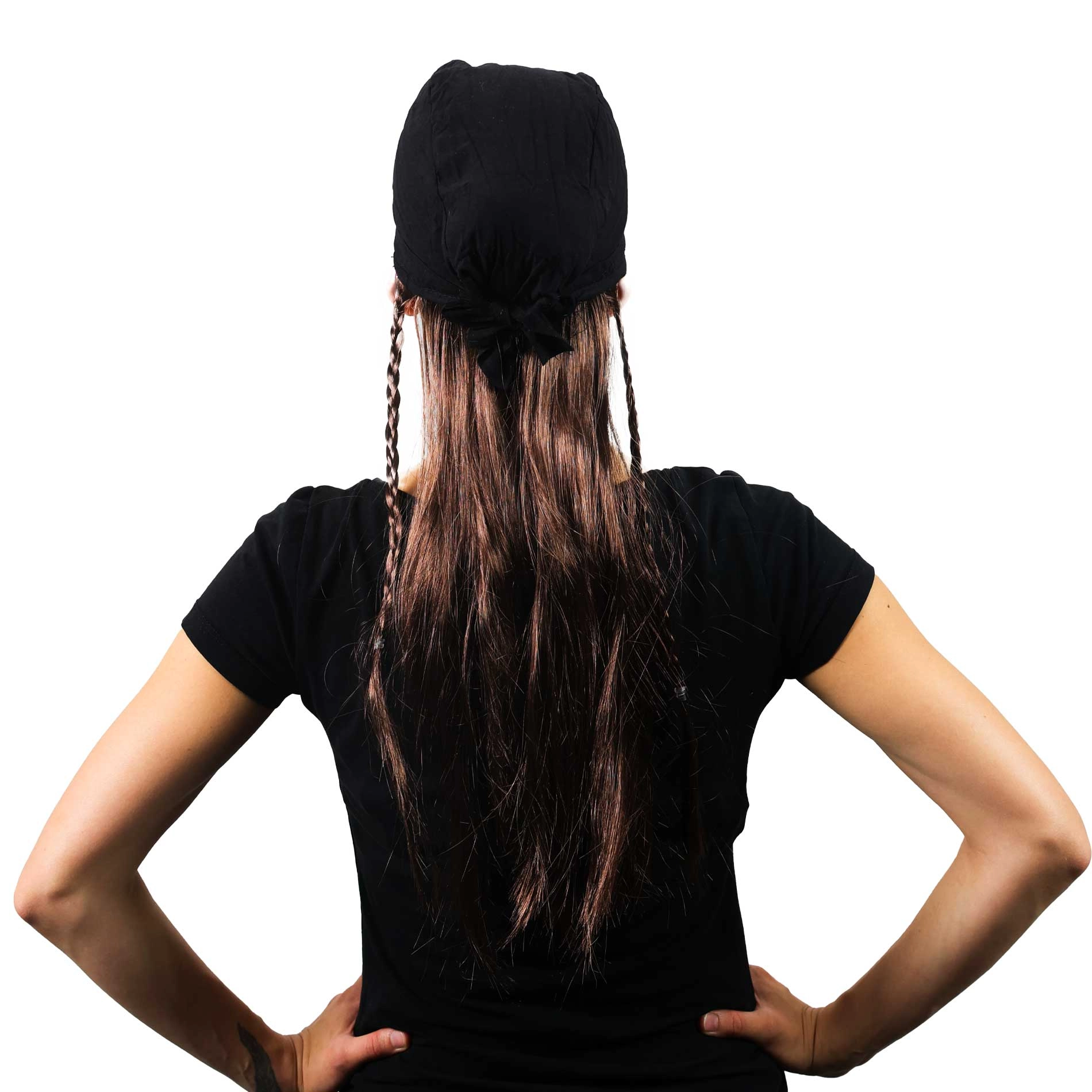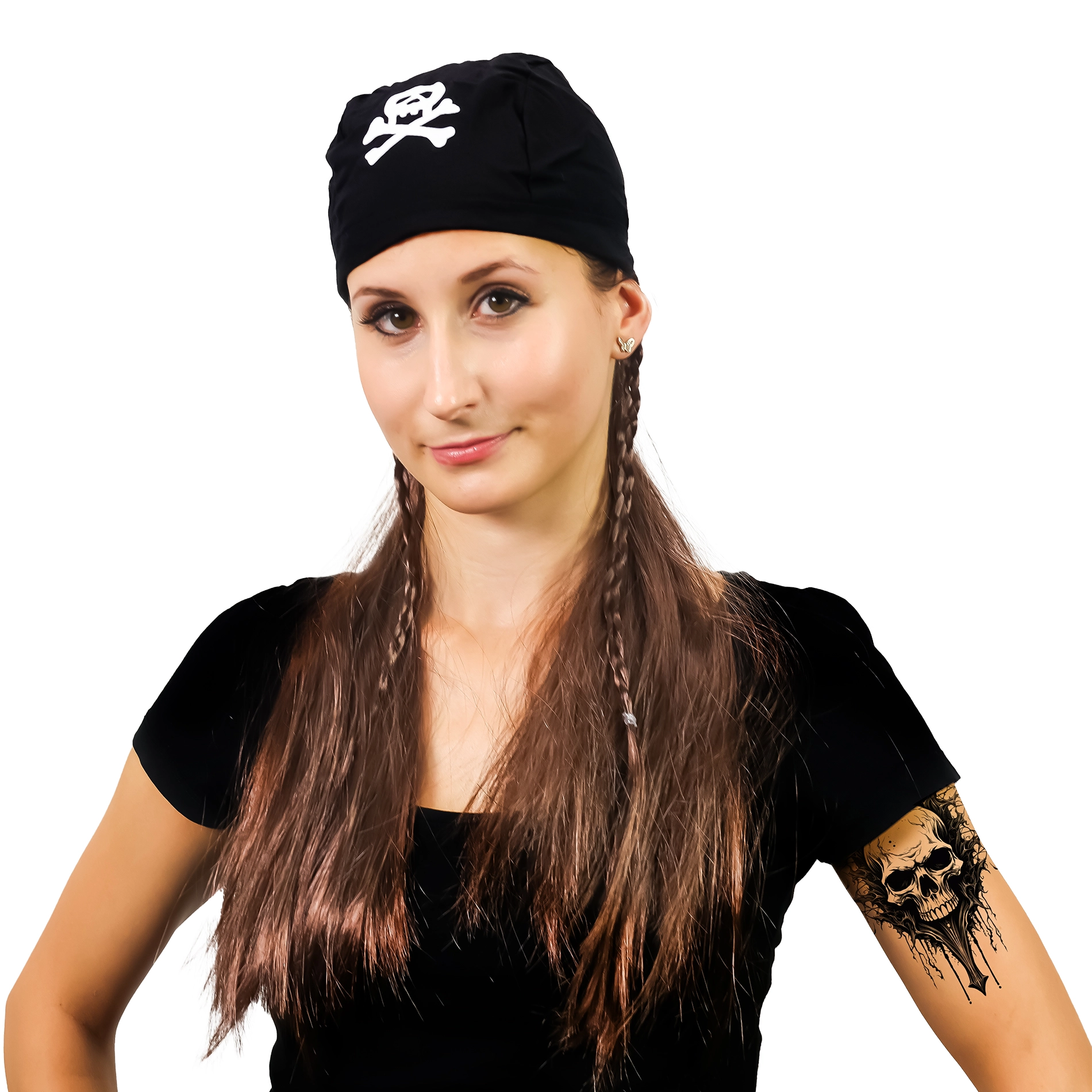 - Autentiška išvaizda – juoda skarelė su kaukole ir vešlūs plaukai