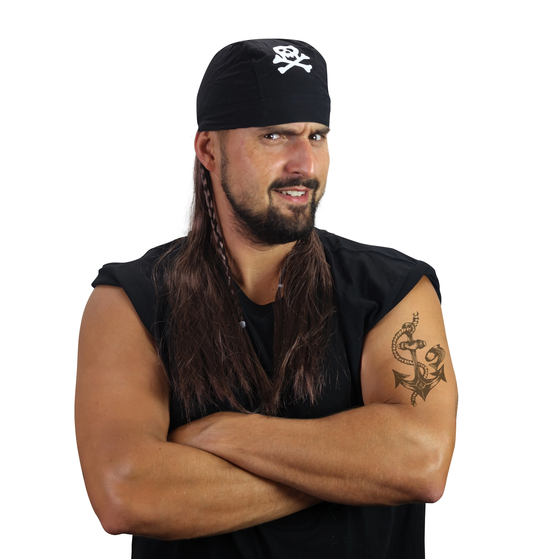 Įsikūnykite į bebaimį piratą per kelias akimirkas. Šis pirato perukas su skarele išsiskiria ryškiu pirato įvaizdžiu su kaukolės ir sukryžiuotų kaulų simboliu, kuris iš karto patraukia dėmesį. Puikiai tinka karnavalui, Helovinui, maskarado baliui ir teminiams vakarėliams.