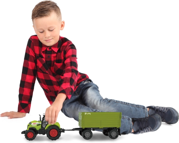 Atraskite realistišką ūkininkavimo pramogą su kompaktišku traktoriumi ir priekaba, kuris idealiai tinka mažoms vaiko rankutėms. Priekabą lengva atjungti ir atidaryti, todėl „krovinių“ pervežimas yra vieni niekai. Dėl laisvo riedėjimo traktorių lengva valdyti ir jis sklandžiai važiuoja lygiomis dangomis.