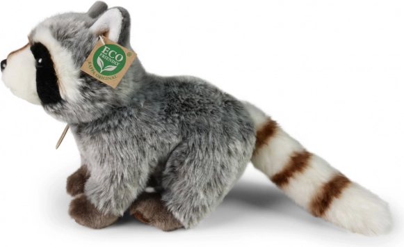 Pliušinis meškėnas turi detales, įskaitant dryžuotą uodegą ir kontrastinius kailio raštus, pabrėžiančius jo realistišką išvaizdą.