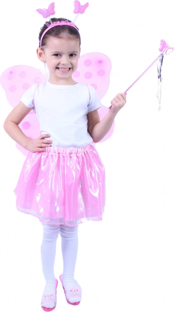 Rožiniai sparnai su taškuotu (polka dots) raštu suteikia kostiumui magiško žavesio ir yra lengvi bei patogūs vaikams.