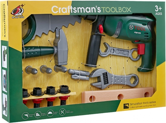 Pilnas vaikiškas rinkinys mažiesiems meistrams suteikia realistišką žaidimą su įrankiais, tokiais kaip akumuliatorinis gręžtuvas, plaktukas, rankinis pjūklas, raktai ir kiti priedai. Gręžtuvas veikia su 2× AA 1,5 V baterijomis (nepridedamos) ir padeda lavinti smulkiąją motoriką, kūrybiškumą ir vaizduotę.
