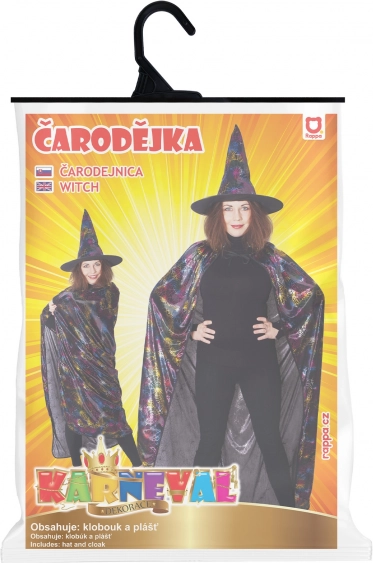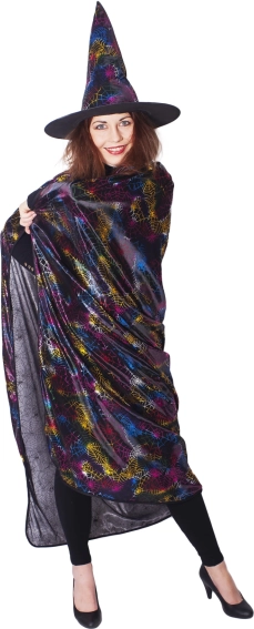 Šis kruopščiai sukurtas kostiumas idealus kiekvienam, kuris nori mėgautis magiškais vakarais dramatišku stiliumi. Į komplektą įeina nuostabi mantija su spalvotais voratinklių raštais ir deranti skrybėlė, suteikianti visam įvaizdžiui tikrą burtų atmosferą.