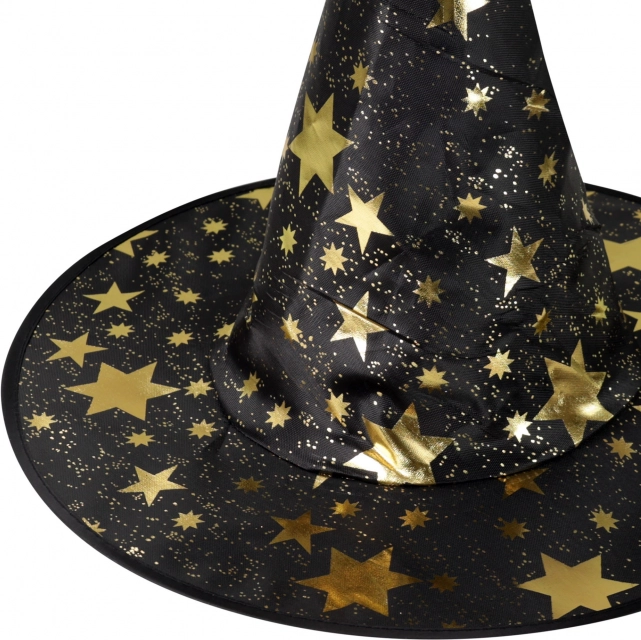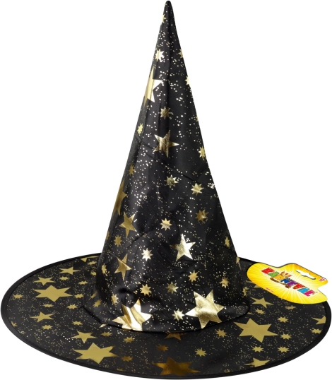 Akimirksniu tapkite maža ragana ar burtininku. Ši juoda skrybėlė su auksinėmis žvaigždėmis – puikus kostiumo aksesuaras Helovinui, vaikų šventėms ir mokyklos karnavalams. Dėl lengvos medžiagos ją malonu dėvėti, o forma gerai išlaikoma.