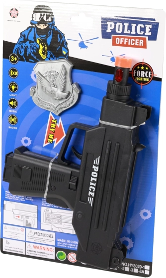 Realistiškas policinis automatas mažiesiems veiksmo herojams. Paspaudus gaiduką, skleidžia realius garsus ir įsijungia šviesos efektai, todėl pramoga ir vaidmenų žaidimas tampa dar intensyvesni. Idealu vaikams nuo 3 metų.