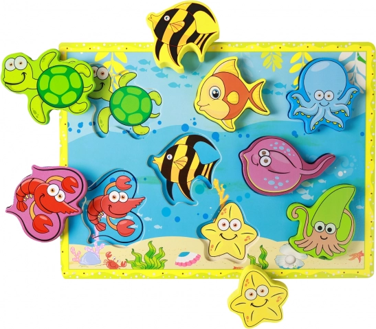 Atraskite žavingą povandeninio pasaulio pasaulį su šia kokybiška medine dėlione–įstatykle patiems mažiausiems. Ryškiaspalvės jūros gyvūnėlių dalys padeda pažinti formas ir spalvas, lavina smulkiąją motoriką ir akies–rankenos koordinaciją, o vaikas žaismingai treniruoja susikaupimą ir loginį mąstymą.