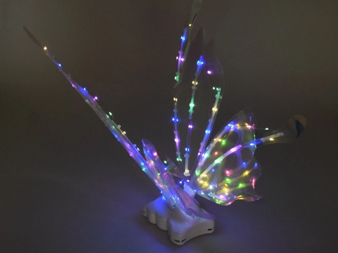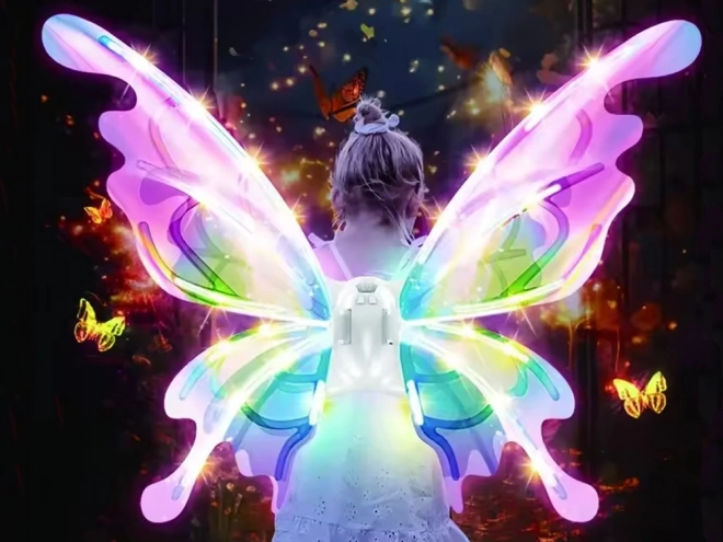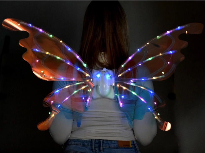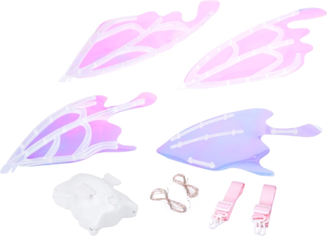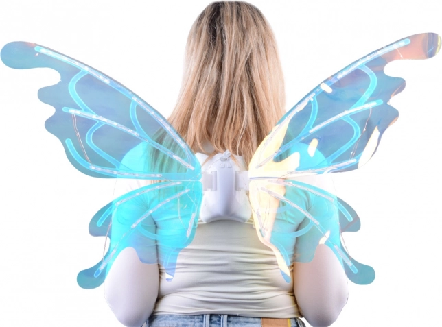 Šie žavingi vaikiški sparnai primena didelius drugelio sparnus, kurie, priklausomai nuo šviesos kampo, nuostabiai žvilga ir keičia spalvas. Integruotas LED apšvietimas ir mechaninis sparnų judėjimas kuria efektingą pasirodymą, džiuginantį kiekvieną mažą fėją, elfą ar drugelį.