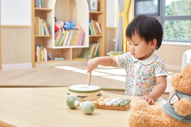 Rinkinyje yra tambūrinas, ksilofonas ir marakasai, leidžiantys vaikams eksperimentuoti su skirtingais garsais ir ritmais.