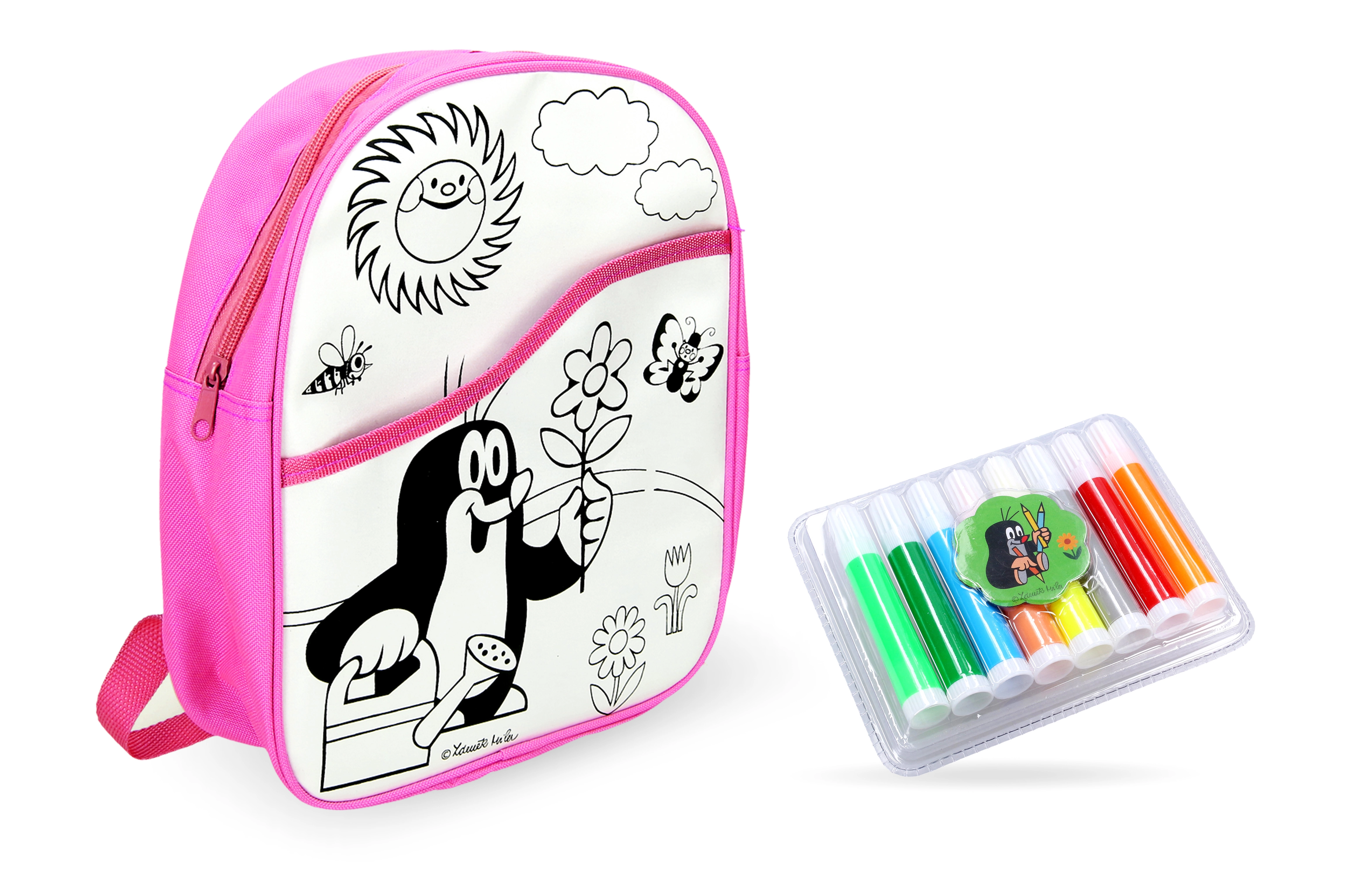 Spalvinamas rožinis kuprinė su Kurmiu – puiki dovana vaikams nuo 3 metų. Kuprinė tiekiama su 8 spalvotų flomasterių rinkiniu, leidžiančiu vaikams kurti savo dizainus ir lavinti kūrybiškumą.