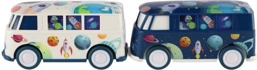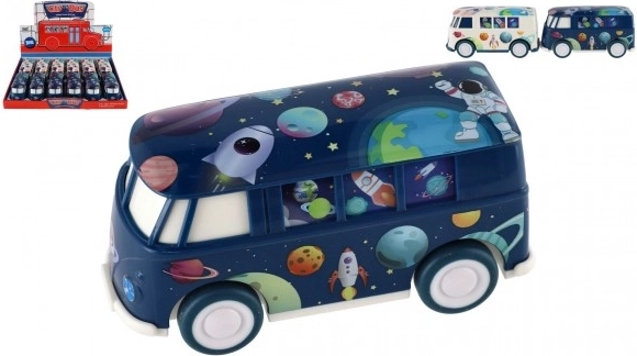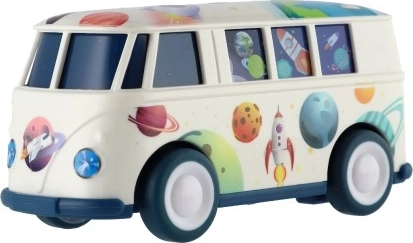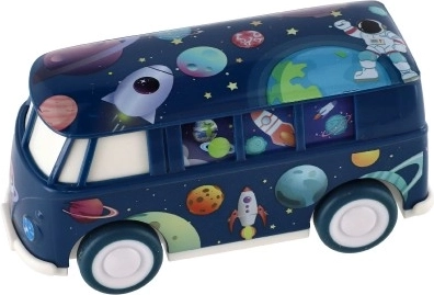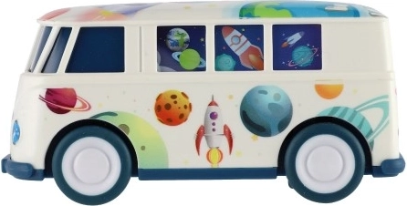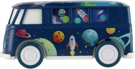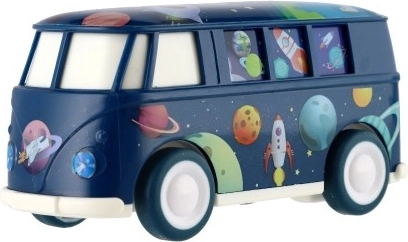 Autobusas sukurtas su ryškiomis spalvomis ir kosminiais motyvais, kurie patrauks kiekvieno vaiko dėmesį.