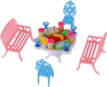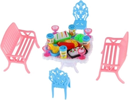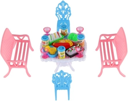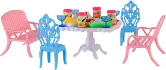 Palepinkite savo lėles stilingomis vaišėmis su šiuo valgomojo baldų rinkiniu, kuriame yra 2 suoliukai, 2 kėdutės ir stalas, papildyti 13 realistinių priedų (taurelės, skardinės, lėkštės ir padėklas). Ryškios spalvos ir kokybiškas plastikas lavina vaizduotę ir smulkiąją motoriką – idealiai tinka lėlių nameliui.