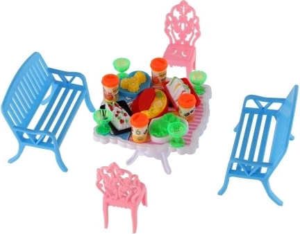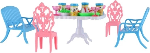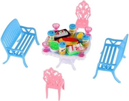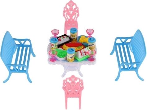 Rinkinyje yra 2 suoliukai, 2 kėdutės ir stalas, papildyti 13 aksesuarų – taurelėmis, gėrimo skardinėmis, lėkštėmis ir padėklu. Viskas, ko reikia jūsų lėlių puotai.