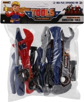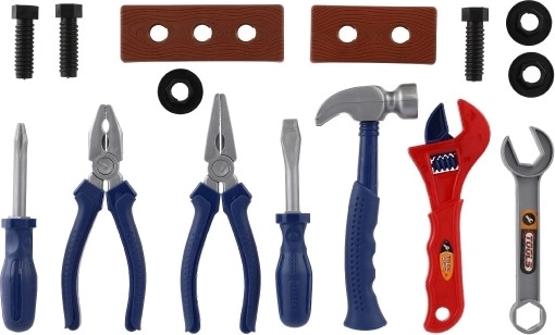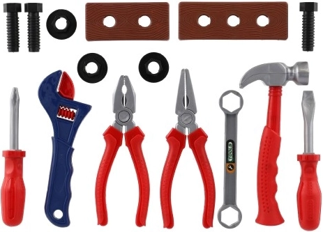 Rinkinyje yra tipiški įrankiai, tokie kaip plaktukas, atsuktuvas, replės ar raktas, taip pat veržlės ir varžtai sukimui lavinti. Dėl praktiško maišelio tvarkymasis ir nešiojimas tampa vieni juokai – puikiai tinka ir kaip dovana.