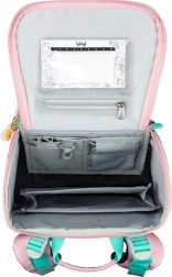 Nauja atverčiamo atidarymo sistema leidžia pasiekti reikmenis tiesiai nuo suolo. Viduje yra permatoma kišenė tvarkaraščiui, organizatorius su gumyte ir izoliuota priekinė kišenė užsegama sagtimi.