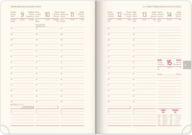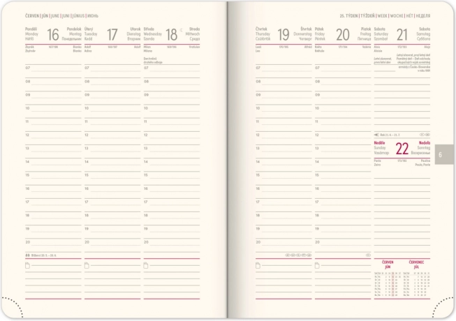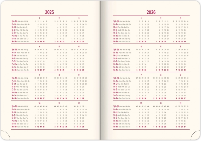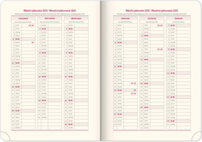 Savaitinis Notique Twill 2025 elegantiškos mėlynos–sidabrinės spalvos yra ideali priemonė jūsų dienų planavimui. Siūlo aiškų savaitinį tvarkaraštį su čekų–slovakų kalendoriumi ir daugiakalbiais užrašais.