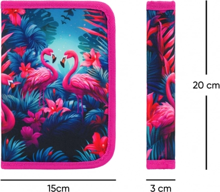 Ryškus flamingų ir tropinių gėlių raštas rožiniuose–mėlynuose atspalviuose suteikia penalui žaismingą išvaizdą, kurią pamėgs vaikai.