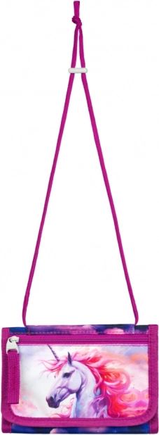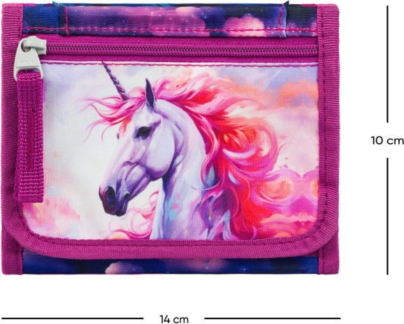 Ši lengva piniginė su magišku vienaragio motyvu pradžiugins kiekvieną vaiką. Dėl virvelės ją patogu nešioti ant kaklo, todėl ji visada po ranka ir kartu saugi. Patvarus tekstilinis audinys tinka kasdieniam naudojimui mokykloje, būreliuose ir kelionėse.