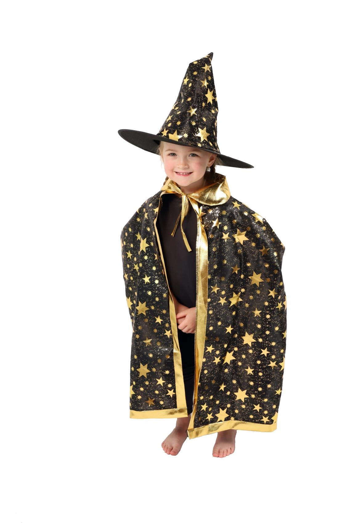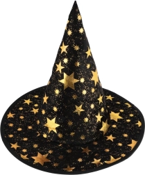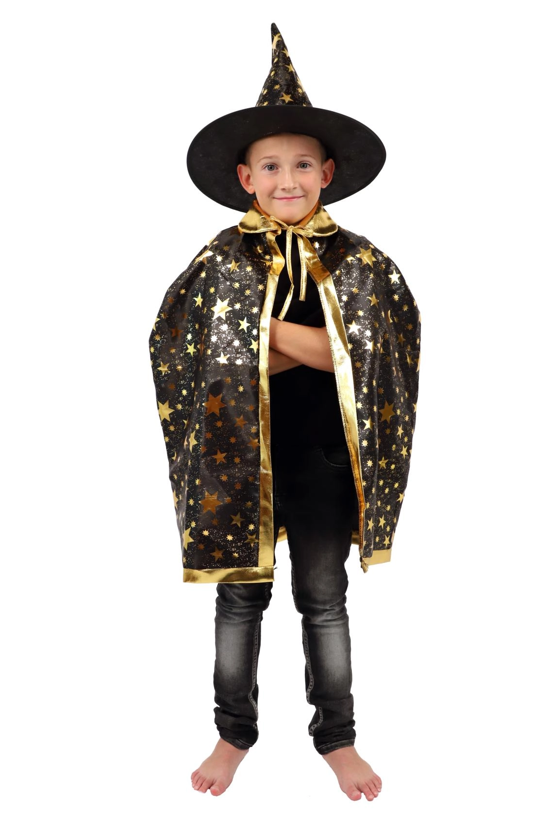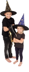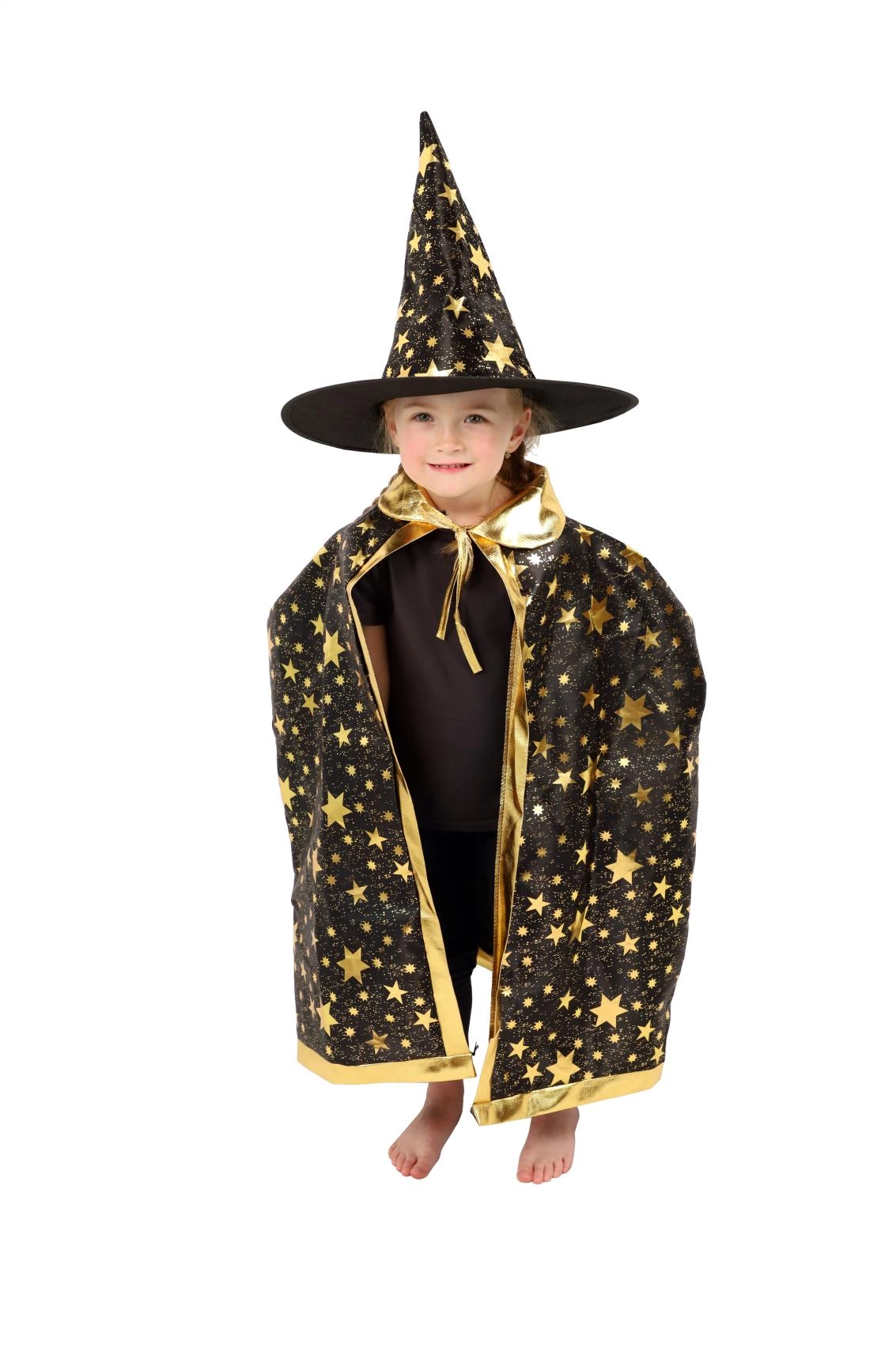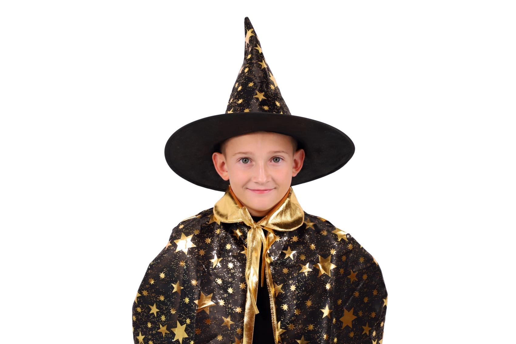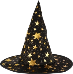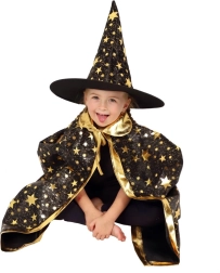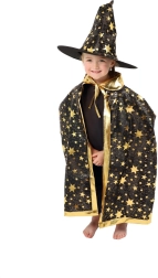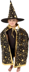 Paverskite savo vaiką mažuoju burtininku. Šis juodai auksinis žvaigždėmis margintas rinkinys apima išraiškingą raganos kepurę ir derantį apsiaustą, puikiai tinkantį vaikų karnavalams, maskaradams ir Helovino šventėms. Dėl lengvų medžiagų rinkinį patogu dėvėti, jis nevaržo judesių per žaidimus ir pasirodymus.