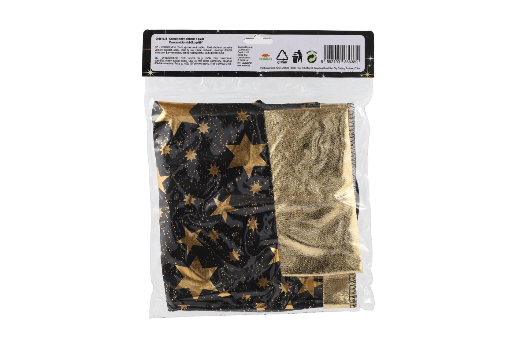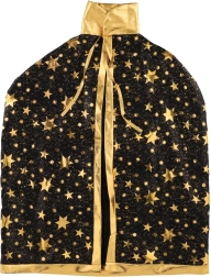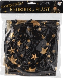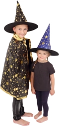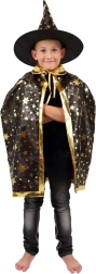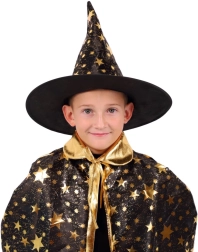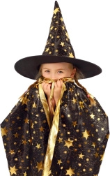 Stilingas rinkinys mažiesiems burtininkams ir raganoms: juodai auksinė raganos kepurė ir apsiaustas su žvaigždžių motyvu. Puikus pasirinkimas karnavalui, Helovinui ir žaidimams namuose. Lengva medžiaga ir ryškus dizainas užtikrina patogų dėvėjimą ir išraiškingą išvaizdą bet kuria proga.