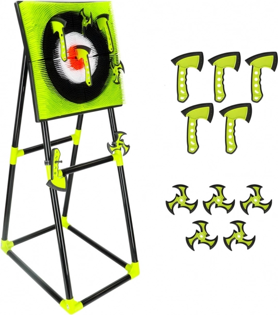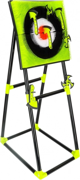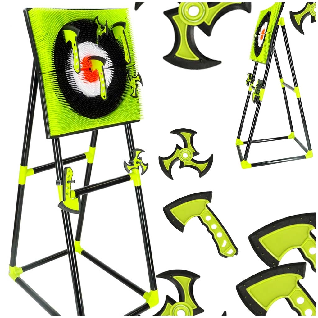 Smagus ir saugus mėtymo į taikinį rinkinys su minkštais silikoniniais kirvukais ir širikenais ant stabilaus stovo. Idealu vaikams nuo 8 metų – lavina smulkiąją motoriką, akių–rankų koordinaciją ir taiklumą. Minkšti silikoniniai antgaliai ir lengvas plastikas užtikrina saugų žaidimą namuose ir lauke.