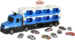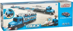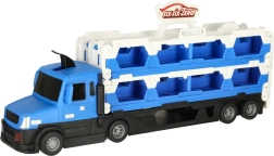 Sunkvežimis siūlo dvigubą pramogą: kaip automobilių transporteris atveža mašinėles į varžybų vietą ir vienu judesiu virsta 210 cm ilgio lenktynių trasa. Integruotas paleidimo įrenginys šauna automobilius į trasą žaibišku greičiu, o šviesos ir garso efektai suteikia lenktynėms tikrovišką atmosferą. Patvari plastikinė konstrukcija puikiai tinka kasdieniam žaidimui.