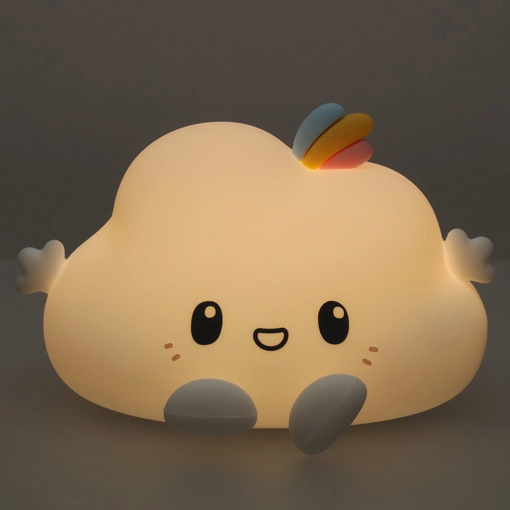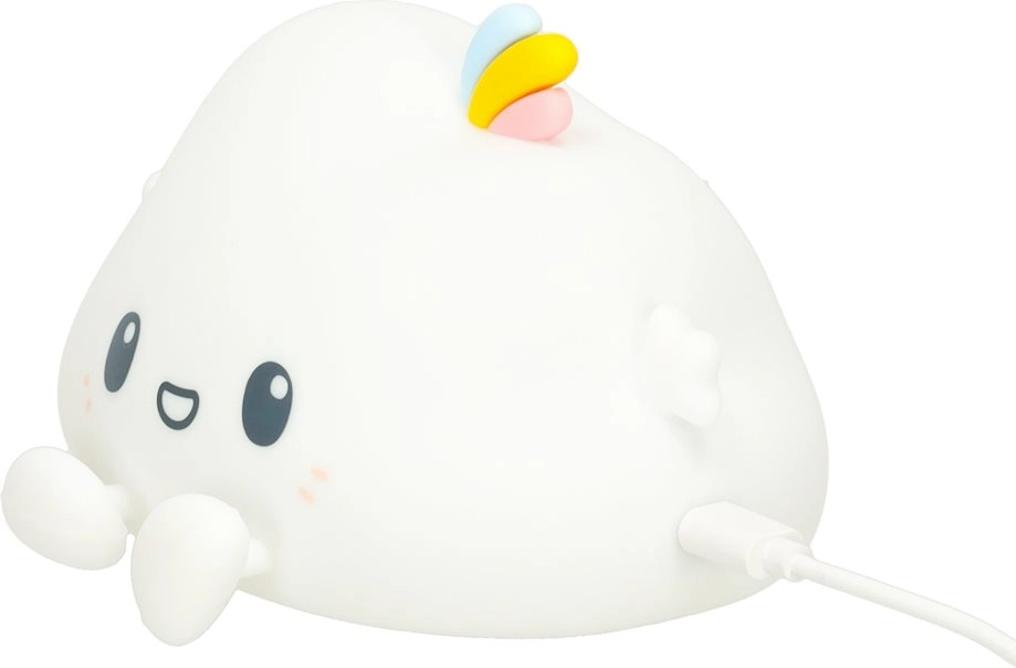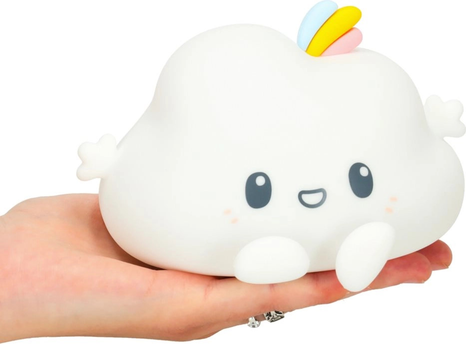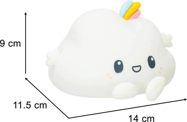 Mielas naktinis debesėlio formos šviestuvas su silikoniniu paviršiumi pradžiugins kiekvieną vaiką. Jis siūlo 3 apšvietimo režimus (šilta balta, RGB kintančios spalvos, vienos spalvos šviesa), jutiklinį valdymą, įmontuotą 1200 mAh akumuliatorių, kuris veikia 9–10 valandų, ir USB įkrovimą. Švelni, maloni šviesa sukuria raminantį atmosferą lengvam užmigimui.