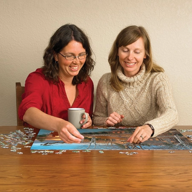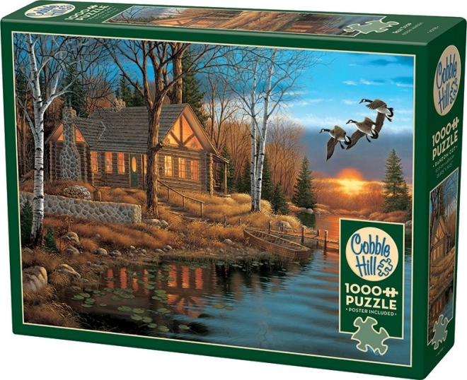 - 1000 detalių su gražiu gamtos motyvu – trobelė, ežeras, saulėlydis ir skrendantys paukščiai