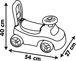 Patogi sėdynė slepia daiktadėžę smulkmenoms, o mechaninis garsinis signalas skatina interaktyvų žaidimą ir priežasties–pasekmės suvokimą. Stumdukas skirtas vaikams nuo 10 mėn., turi 20 cm aukščio sėdynę ir iki 50 kg keliamąją galią, tad lydės vaiką ilgai ir saugiai.