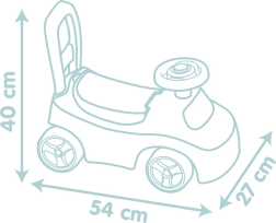 Vairas su signalu suteikia dar daugiau pramogų, o sėdynė su daiktadėže talpina mažus lobius. Priekiniai ir galiniai iškilimai nuo apvirtimo didina saugumą važiuojant ir sustojus. Ideali priemonė mokantis vaikščioti, lavinant pusiausvyrą ir stiprinant kojytes.