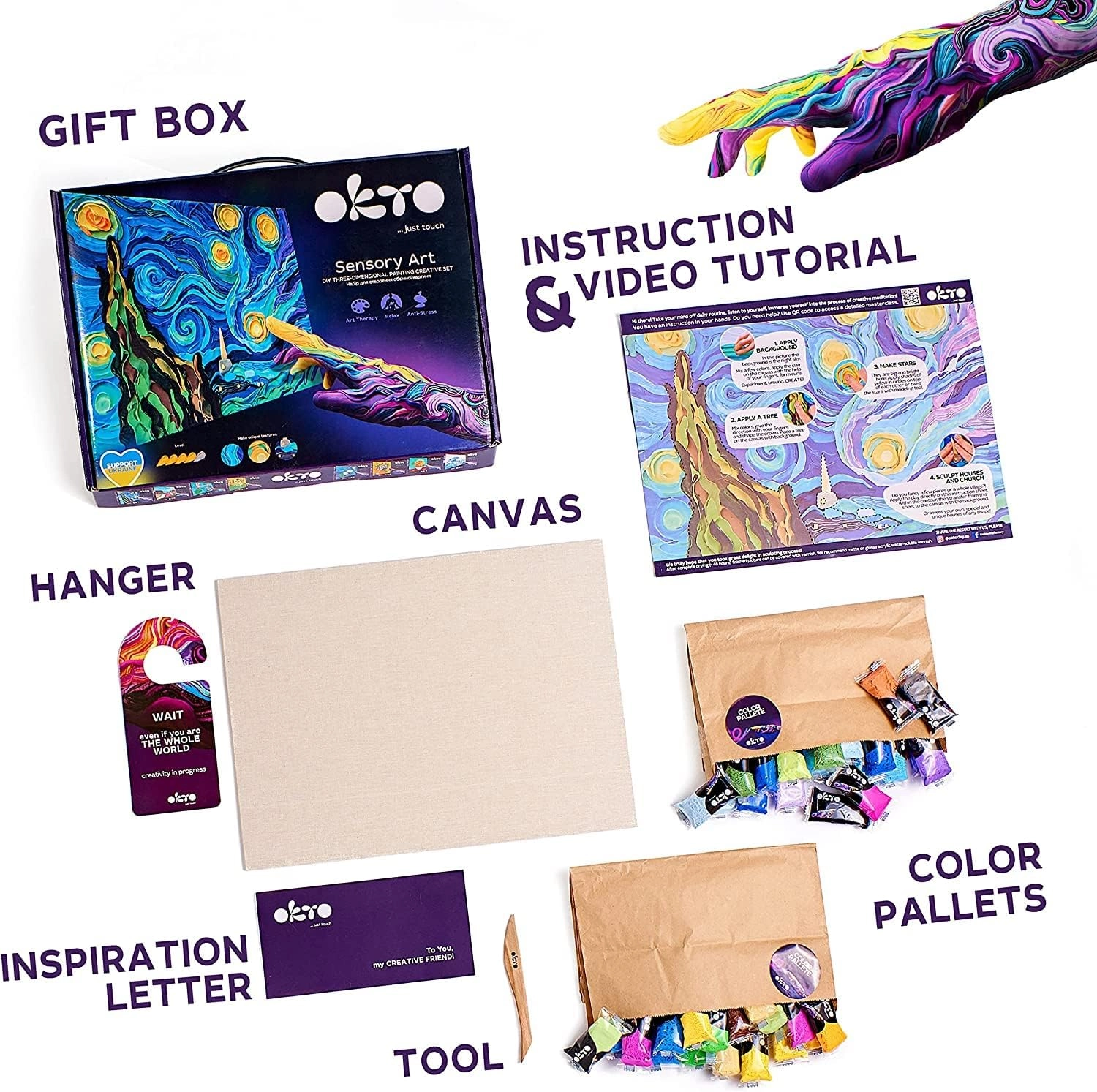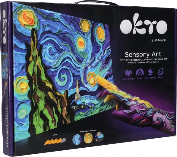 Atraskite kūrybinę patirtį su dailės rinkiniu Okto Sensoty Art – Žvaigždėta naktis, įkvėptu Vincento van Gogo šedevro. Naudodami oras džiūstančią masę (air clay) ir tapymo pirštais techniką sukursite reljefinį paveikslą, kurio sudėtingumo lygis 4/5. Idealu kūrybiškumui ugdyti ir atsipalaiduoti, su drobe, kurios matmenys 30 × 40 cm, ir viskuo, ko reikia pakuotėje.