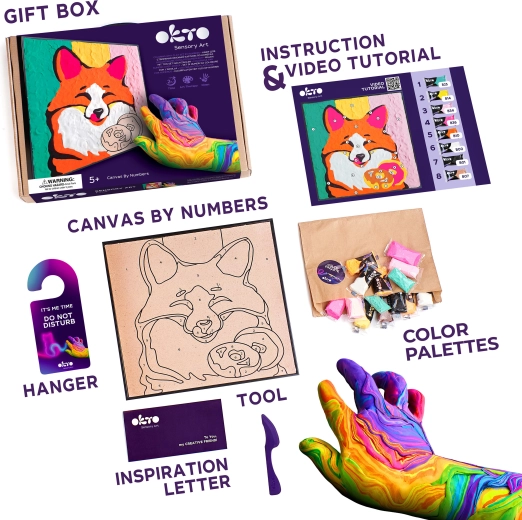 Atraskite kūrybos džiaugsmą su OKTO lapės rinkiniu. Jis sujungia tapybą pirštais ir modeliavimą iš oras džiūstančios masės, todėl lengvai sukursite reljefinį, originalų paveikslą ant kvadratinės 29 × 29 cm drobės. Pridėtas iliustruotas vadovas, kuris ves žingsnis po žingsnio.