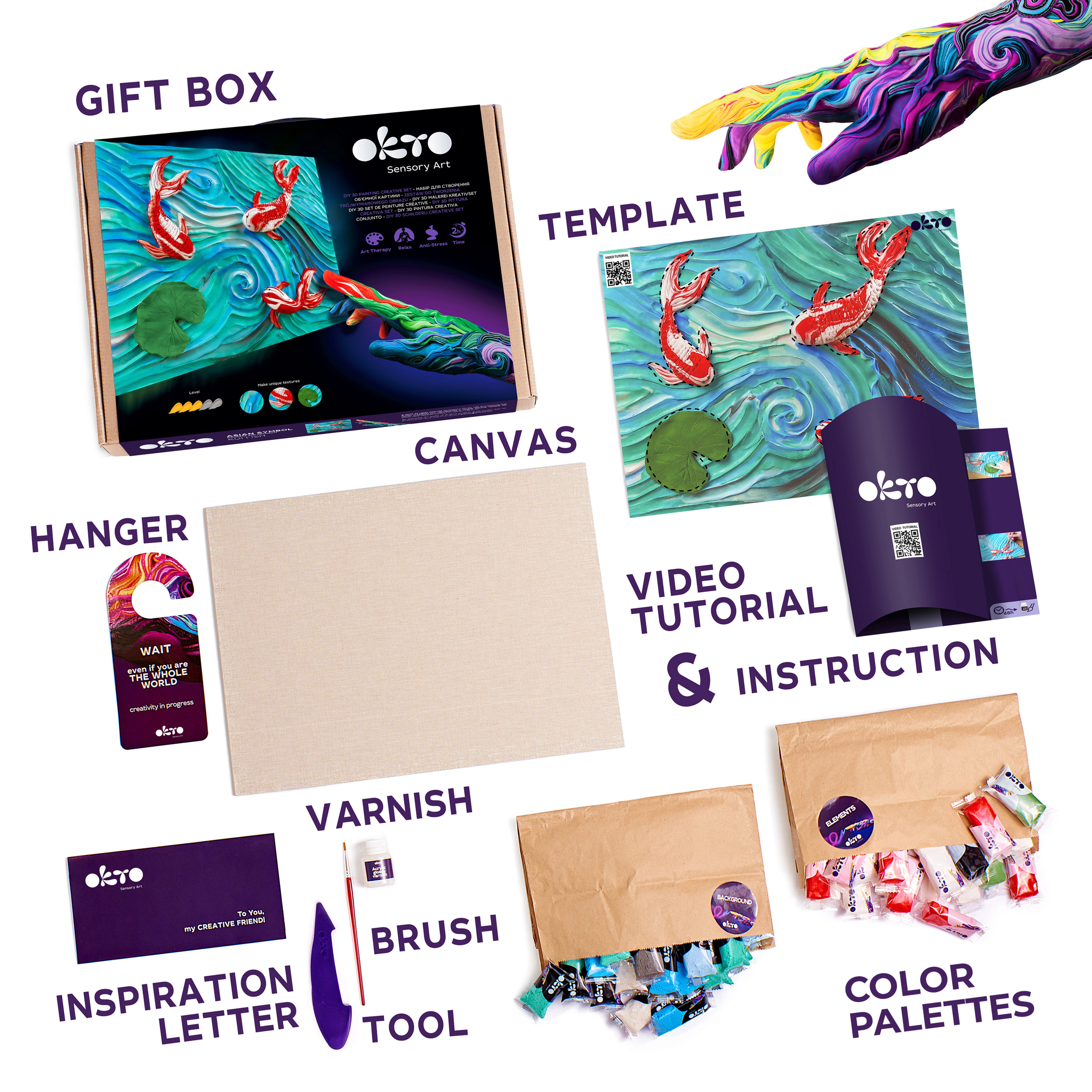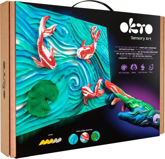 Atraskite atpalaiduojantį kūrybinį procesą su Okto Sensoty Art – Koi karpiai meniniu rinkiniu, formato 30 × 40 cm. Pilnas komplektas su natūraliu drobės audiniu, modeliavimo masėmis ir vandeniu skiedžiamu akriliniu laku leis lengvai ir maloniai sukurti originalų, tekstūrinį kūrinį.