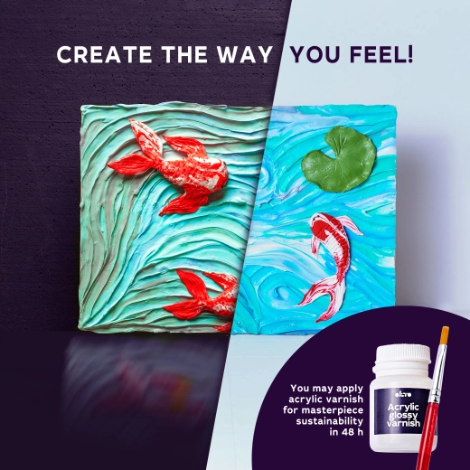 Šis kūrybinis rinkinys tinka tiek pradedantiesiems, tiek pažengusiems. Su pridedamu vadovu ir mediniu formavimo įrankiu sukursite nuostabų koi karpių motyvą su išraiškinga struktūra. Pridėtas akrilinis (vandeniu skiedžiamas) lakas suteiks užbaigtam paveikslui patvarumo ir subtilų blizgesį.