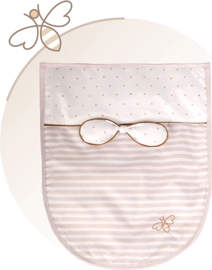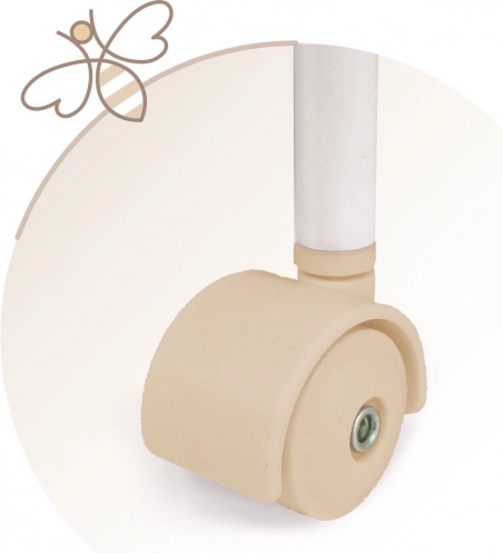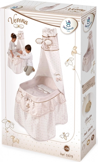 Ši stilinga lėlių lovytė derinama prie švelnių pastelinių smėlio ir baltos atspalvių su subtiliais taškiukais ir juostelėmis. Natūralų vaizdą papildo kaspinėliai, primenantys žiedlapius, ir smulkūs siuvinėti bitučių motyvai, kurie pabrėžia visos VERONA kolekcijos žavesį. Dėl pasukamų ratukų lovytę galima lengvai perkelti iš kambario į kambarį, kad maža globėja visada turėtų savo kūdikėlį šalia.